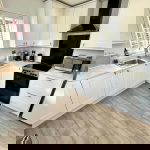 Modern fitted kitchen with a range of wall and base units with worktop surfaces over. Integrated Bosch dishwasher, integrated Beko washing machine, integrated bin, space for electric cooker, glass splashback and matching extractor hood over, space for tall fridge/freezer, single sink with modern mixer tap, upvc double glazed side window and rear window, upvc door leading to the rear garden.