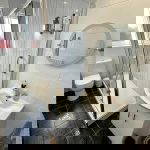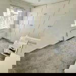 Spacious walk in double shower cubicle with thermostatic control shower, low level w/c, modern pedestal wash basin with vanity unit below, tiled floors, mainly tiled walls, radiator, upvc double glazed obscure window.