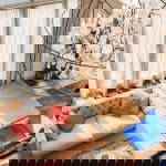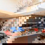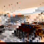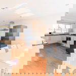 Entrance of the Farmhouse into large sitting room/dining room with double sided fireplace. Views over the garden and entrance through to the superb kitchen.